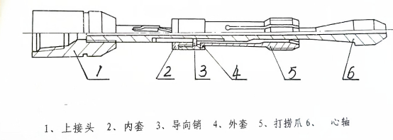 提放式撈矛是一種內(nèi)撈工具。既象油管一樣,與落魚上部的油管接箍對扣,通過換瓦又能撈無扣管柱,然后靠心軸錐面脹開打撈爪咬緊接箍或管柱。當(dāng)落魚嚴(yán)重遇卡時可順序下放,然后上提管柱即可退出打撈工具,避免事故復(fù)雜化,即減輕工人勞動強(qiáng)度,又可縮短修井周期。