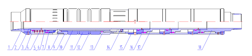 2)坐封:由油管進行加壓,當壓力升至一定數(shù)值(一般為3-4Mpa),活塞剪釘剪斷繼續(xù)加壓三級液缸滑動,壓縮封隔件。使其密封油套環(huán)形空間,同時由分瓣爪鎖住,當撤去油管壓力時,封隔件仍處于壓縮狀態(tài),不會退回,繼續(xù)保持密封壓縮狀態(tài),這樣坐封過程結(jié)束。